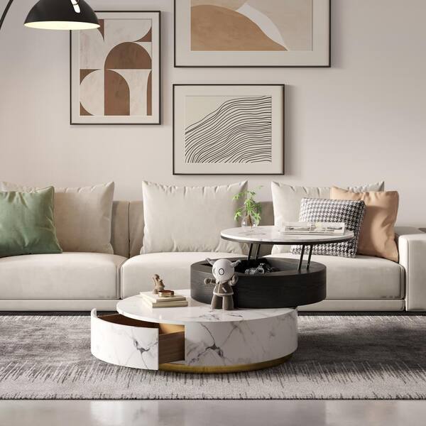 J E Home 35 43 In White And Black Round Sintered Stone Top Modern Nesting Coffee Table Set With Rotatable Drawers And Storage Je Mh Ct1824bw The Home Depot